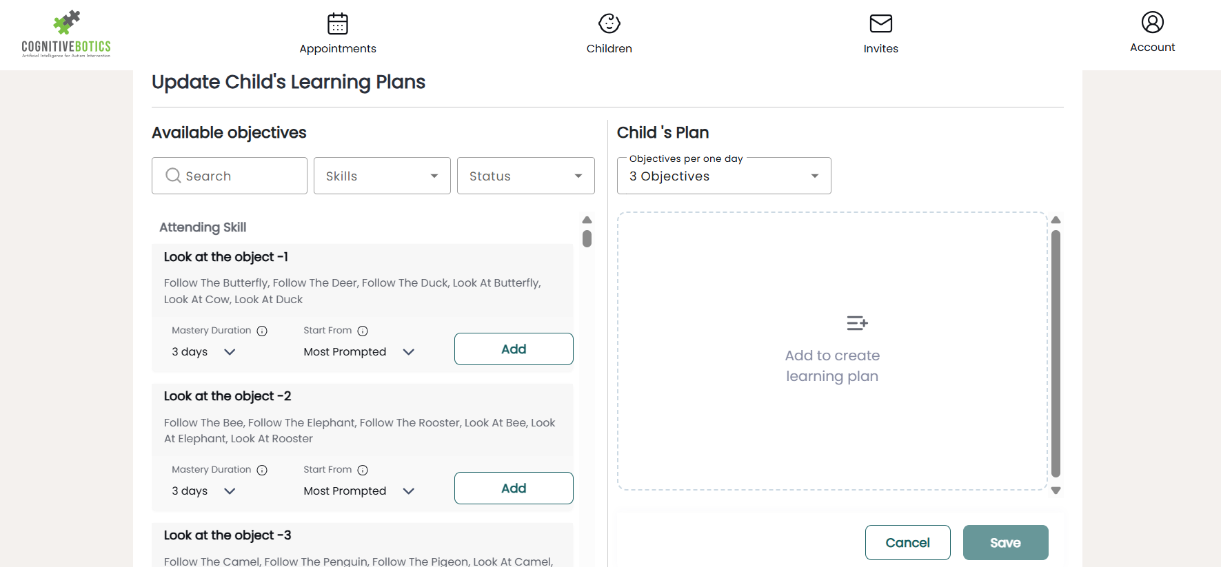 You can create an individualized learning plan for each child. There are three lanes through which three parallel learning objectives can be added. The learning plans can be edited any time.