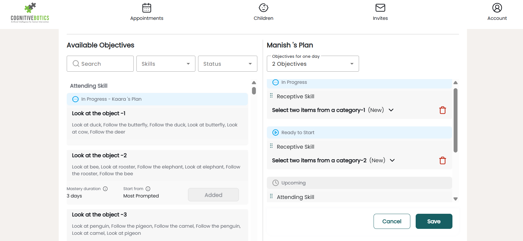 This section has another sub-section, named "Objective for one day". Considering the required screen time of the child the number of playable LO in a day can be customized by the therapist. The learning plan can contain multiple LOs but the number chosen under this, only that number of LOs can be played in a day. After mastering an LO from the top the subsequent LO will be added automatically to the playable LO.